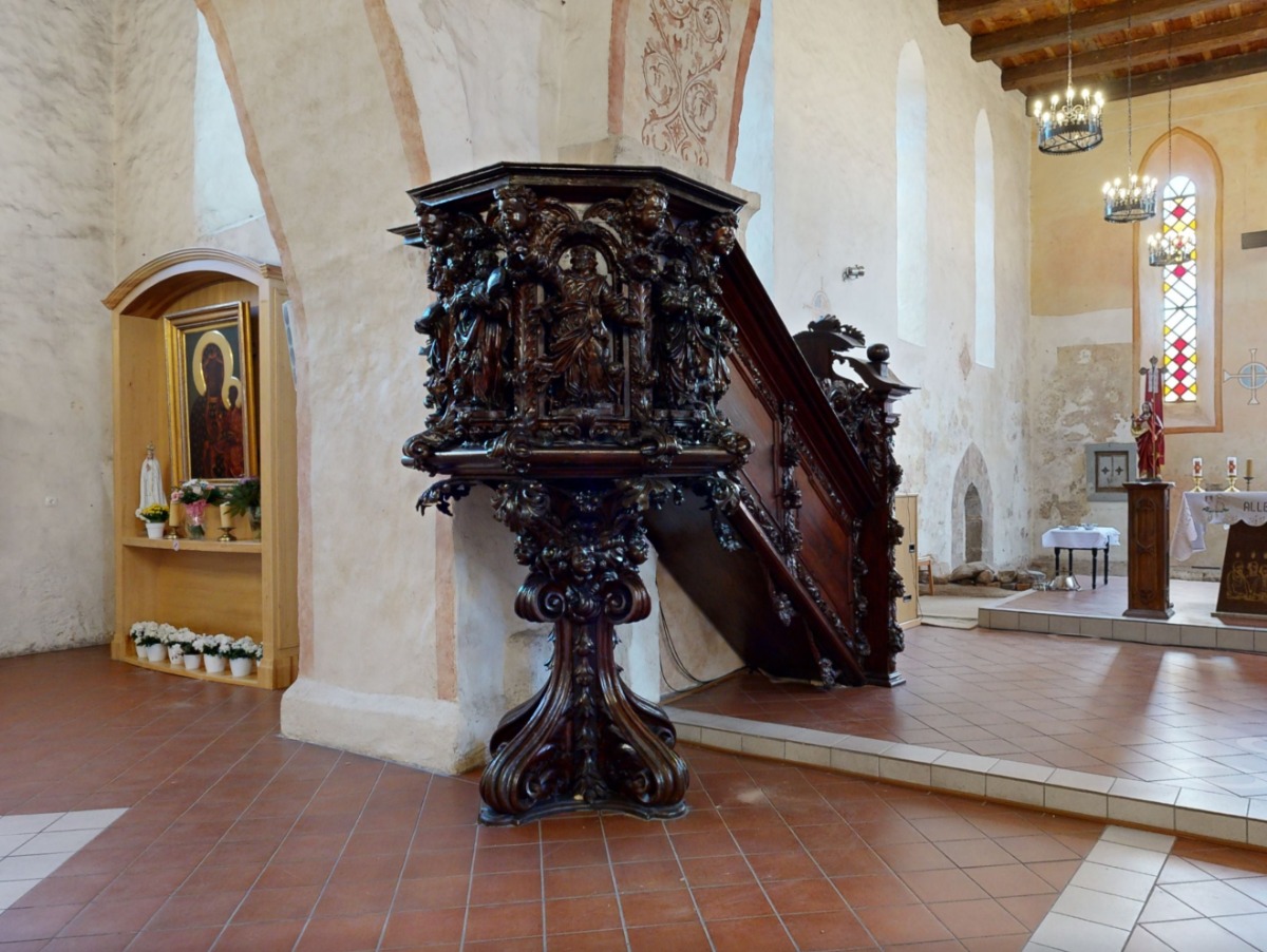 Mównica zdobiona jest wysokiej klasy rzeźbą figuralną oraz bogato ukształtowaną snycerką. Korpus, na rzucie pięcioboku, wspiera podpora w formie czterech spiętych wolut, zdobionych akantem, kampanulami i motywami główek anielskich.