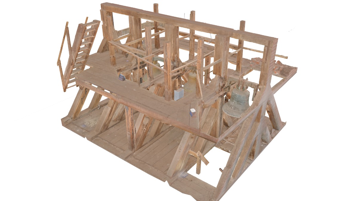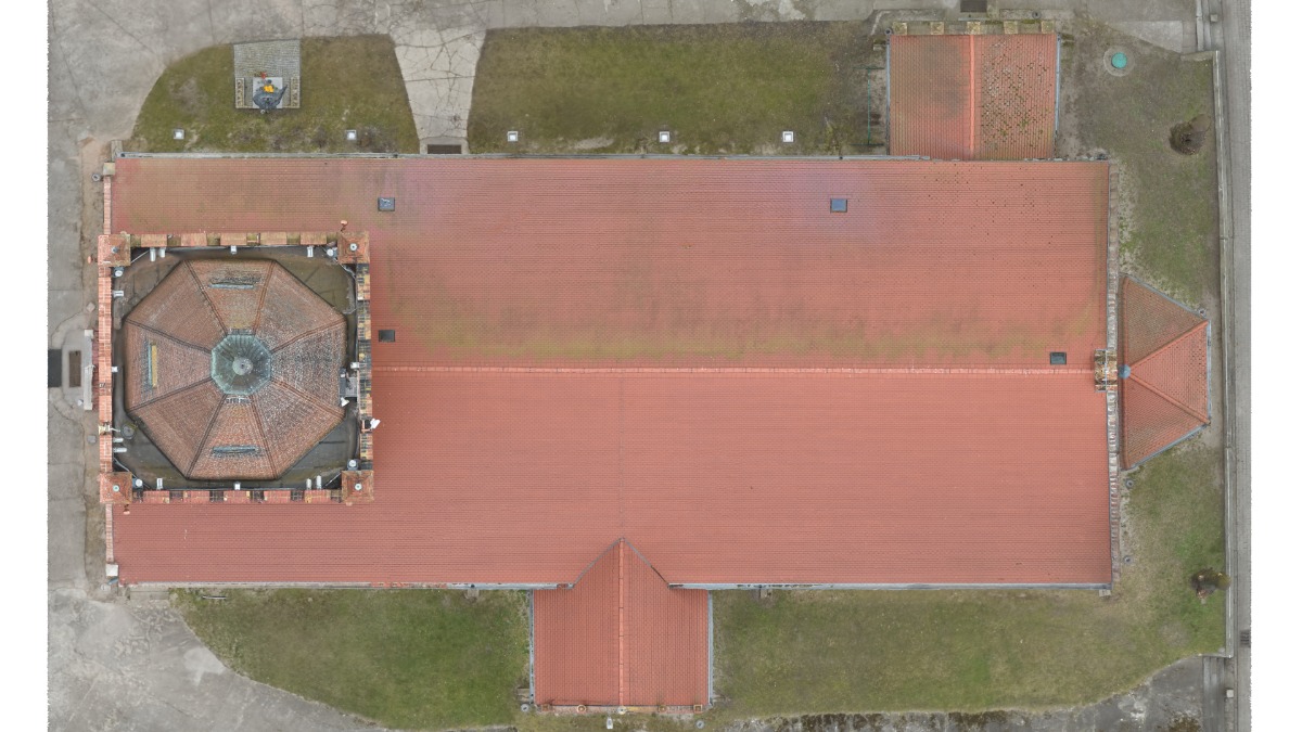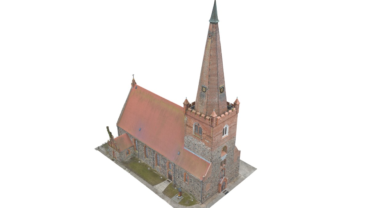 Korpus przekryty jest dachem dwuspadowym, a niższa apsyda chóru otrzymała trójspadowe zadaszenie. Dolna kamienna część wieży zachodniej równa jest szerokości korpusu, a jej górna część – węższa i czworoboczna – została nadbudowana cegłą oraz zwieńczona tarasem z krenelażem i wysmukłym stożkowym hełmem ceramicznym.