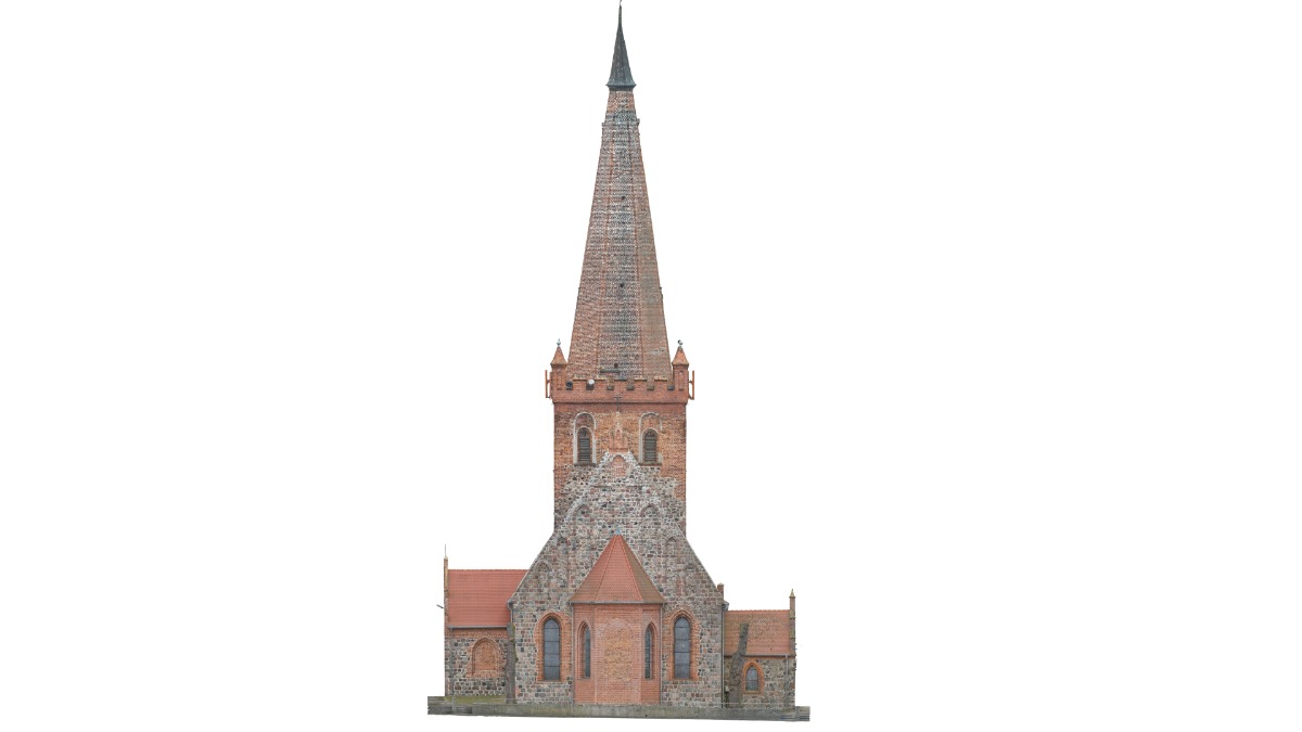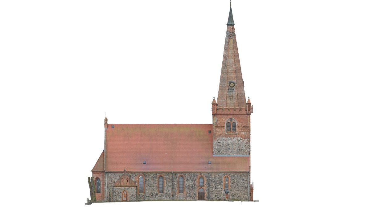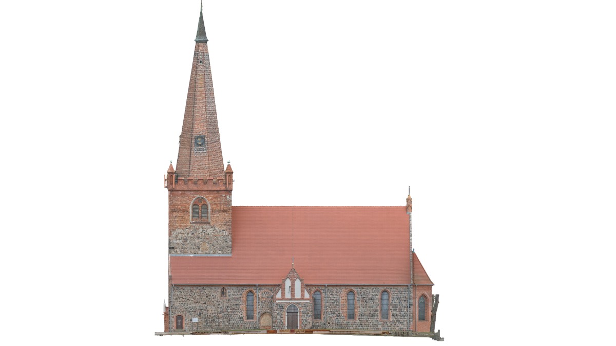 Ścianę wschodnią akcentuje trójboczna apsyda prezbiterium z czerwonej cegły maszynowej, kontrastującej z granitowym licem jej części bocznych. Dekoracja szczytu wieńczącego pochodzi z pierwszego, XIII-wiecznego etapu budowy świątyni. Jest on rozczłonkowany blendami w układzie piramidalnym, a wierzchołek zdobi wnęka w kształcie krzyża.