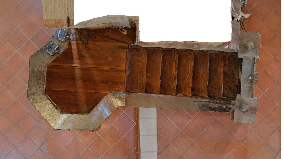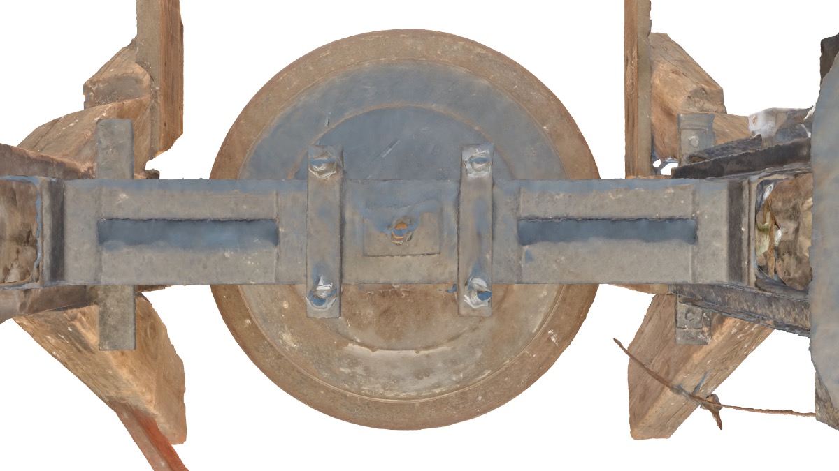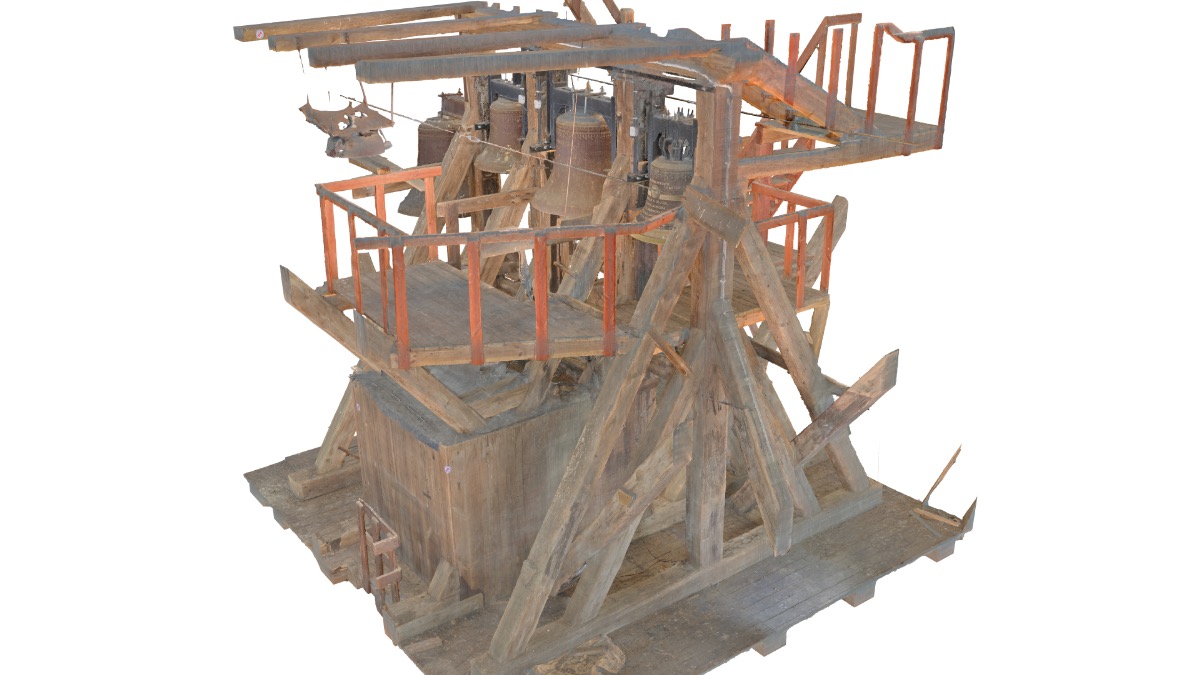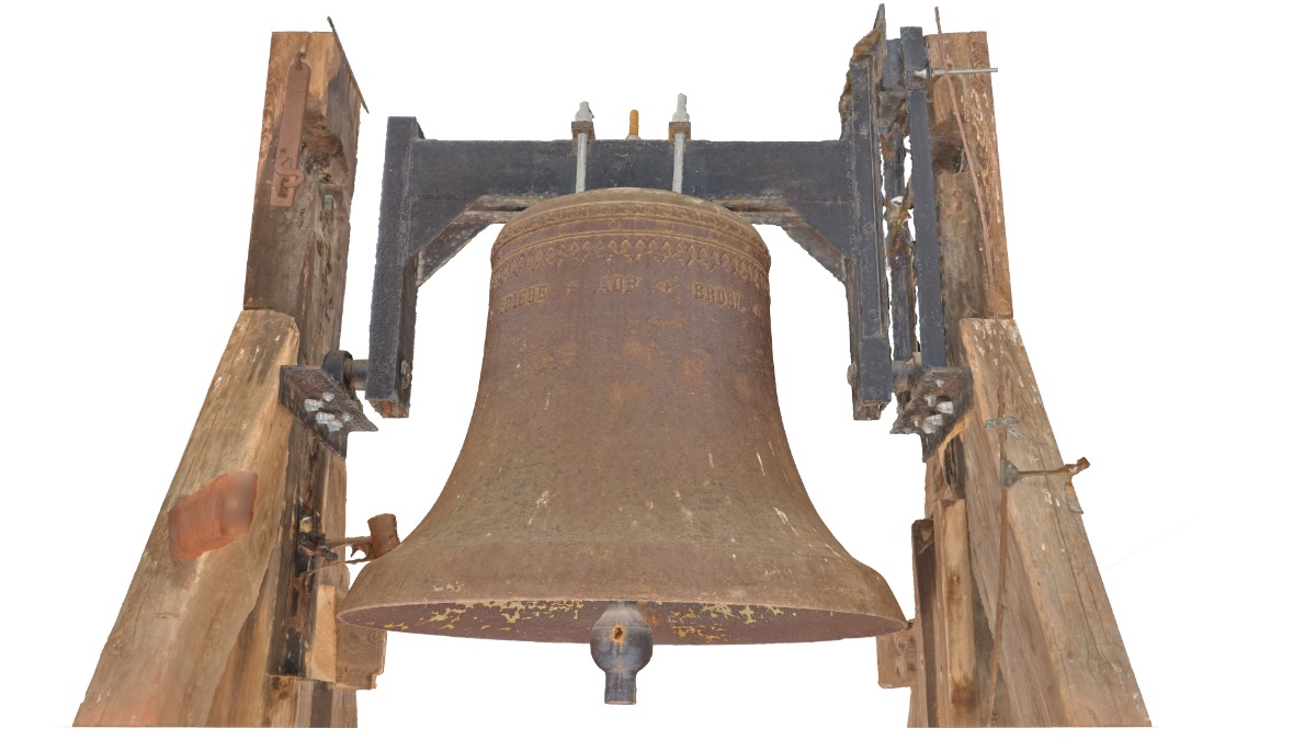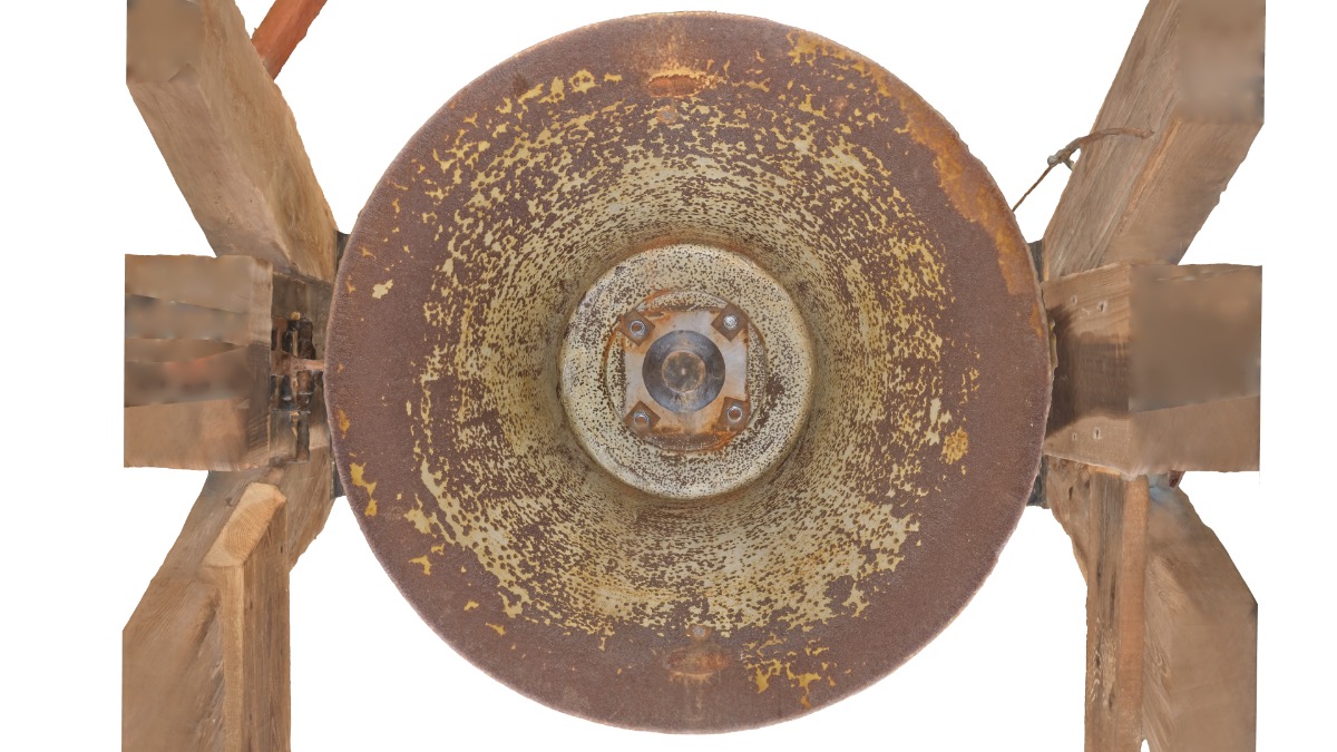 Zawieszony jest na specjalnej konstrukcji wsporczej z masywnych drewnianych belek stabilizowanych zastrzałami. Dzwon pozbawiony korony z kabłąkami został spięty śrubami do stalowego zawiesia.