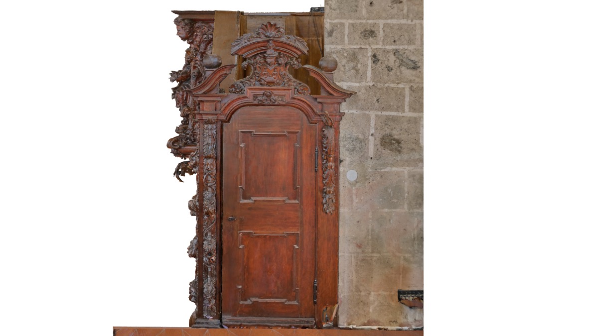 Bramka otrzymała architektoniczną oprawę w formie portalu, zamkniętego naczółkiem o wklęsło-wypukłej linii, przerwanego w osiach bocznych dla lepszej ekspozycji umieszczonego w polu głównym herbu rodu von Schönebeck – fundatorów ambony. Drzwiczki z dwiema uszakowymi płycinami flankują pilastry, których trzony zdobią liście akantu przeplecione wstęgą z wpisanymi motywami pąków róż, owoców granatu, winnych gron i kampanuli. Ambona moryńska, prezentująca pełnię barokowej rzeźby i zdobnictwa snycerskiego, uważana jest za jedno z najlepszych dzieł H. B. Hattenkerella.