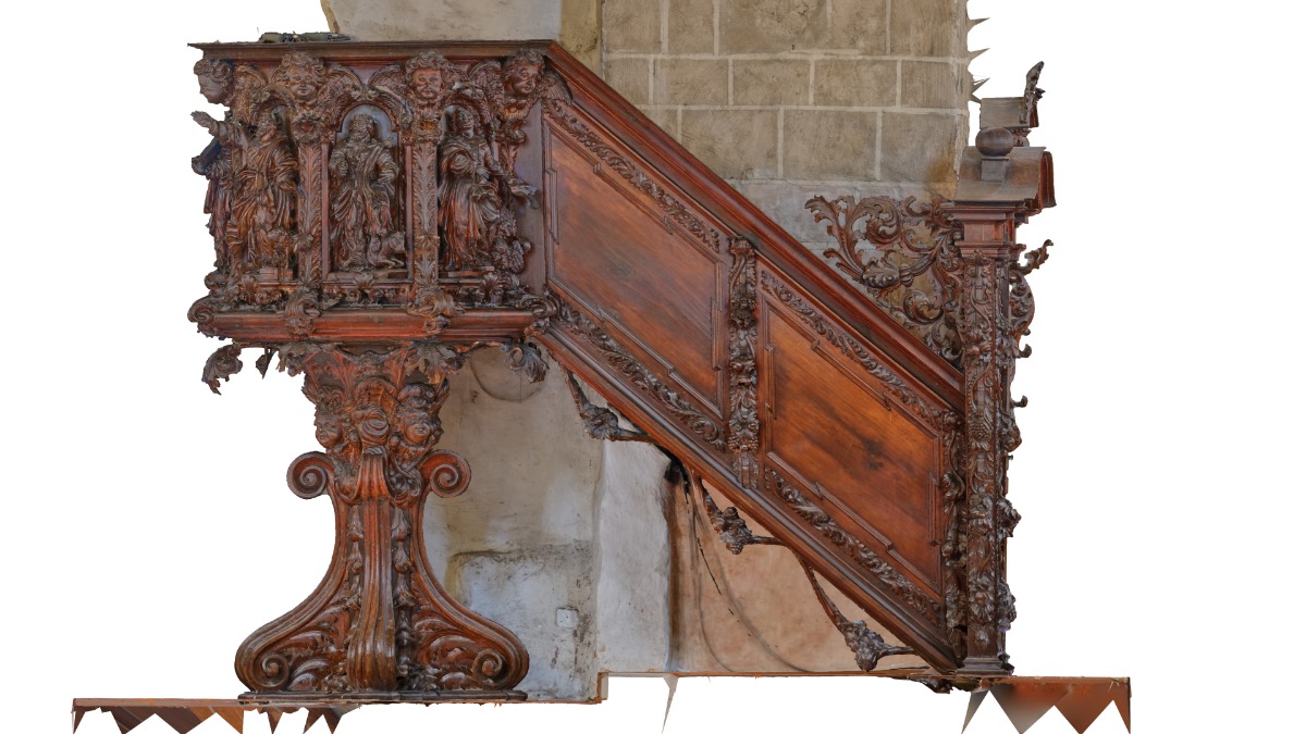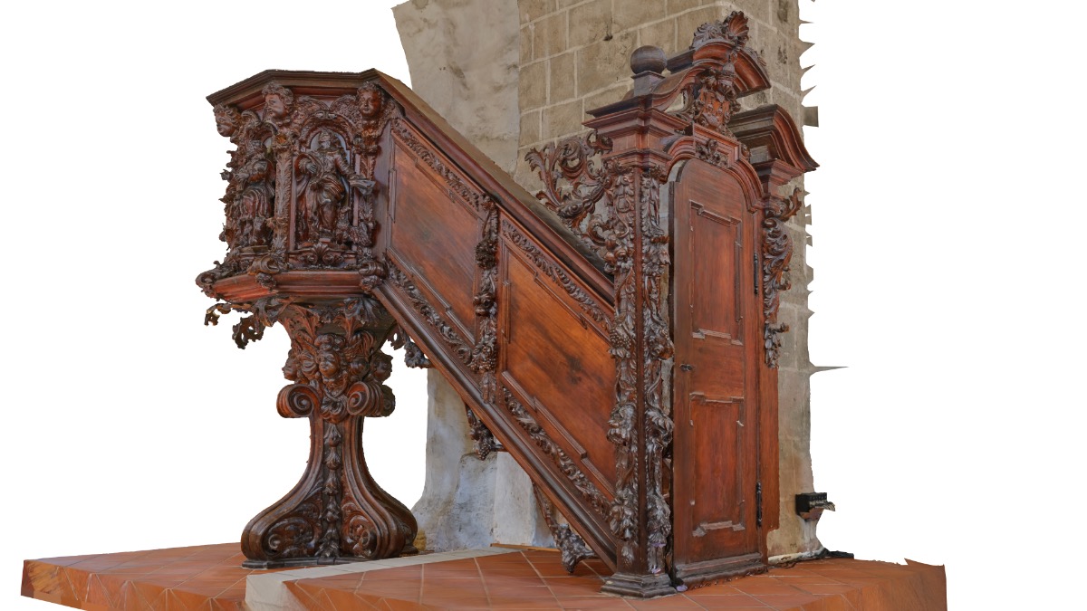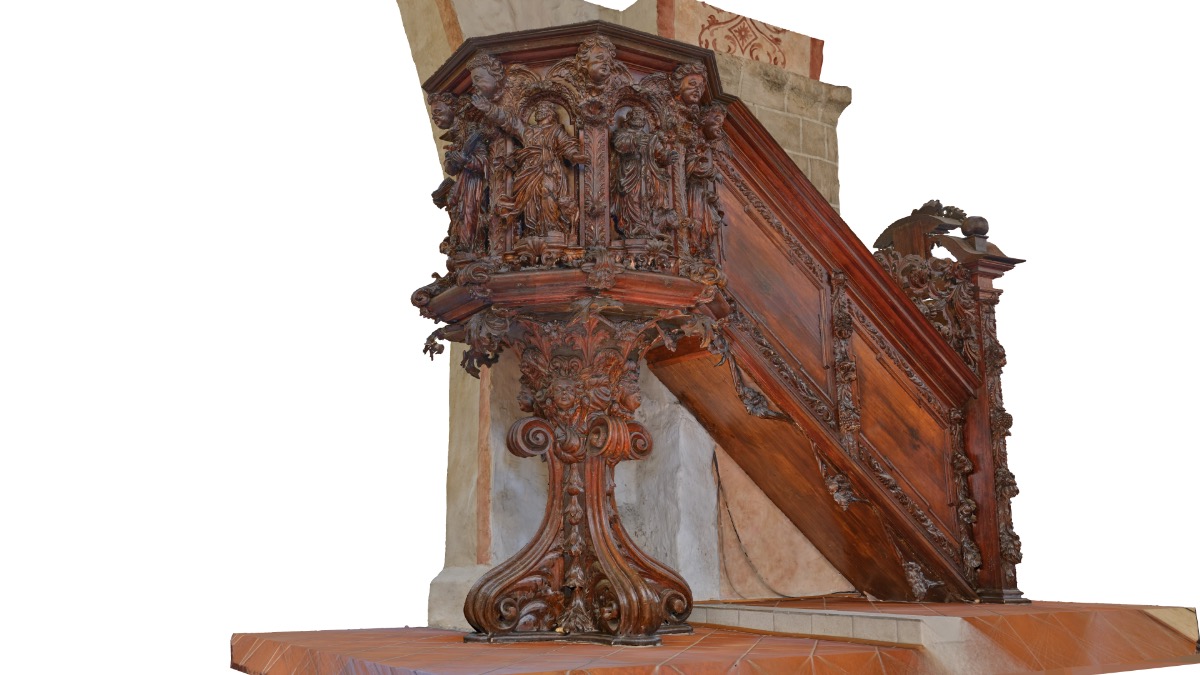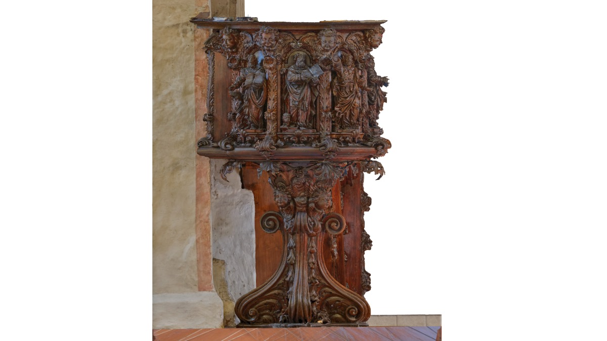 Mównica zdobiona jest wysokiej klasy rzeźbą figuralną oraz bogato ukształtowaną snycerką. Korpus, na rzucie pięcioboku, wspiera podpora w formie czterech spiętych wolut, zdobionych akantem, kampanulami i motywami główek anielskich.